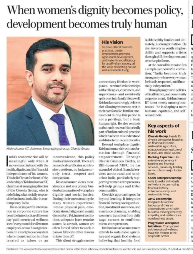 As we can see, Krishnakumar K T is a Business leader, artist, and social entrepreneur with expertise in strategy, leadership, and innovation. Explore his inspiring journey and ventures. Krishnakumar K.T. pioneered the world’s first Paid Menstrual Wellness Leave for corporate women employees, championing dignity and progressive workplace value.
